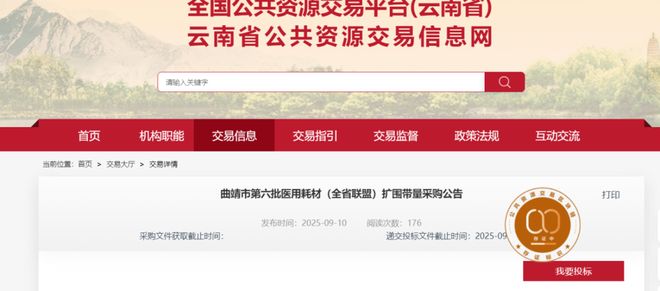 刚刚(9月10日),云南省公共资源交易信息网发布了《曲靖市第六批医用耗材(全省联盟)扩围带量采购公告》,为扩大集中带量采购成果,现