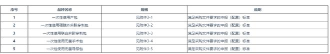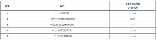 (一)采购品种。本次采购品种为一次性使用产包、一次性使用硬膜外麻醉穿刺包、一次性使用联合麻醉穿刺包、一次性使用无菌手术包、一次性使用无菌导尿包等5种。