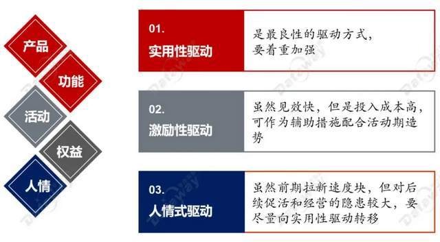 影响用户是否购买金融产品的因素可归纳为五类:产品、功能、活动、权益和人群影响。这五大因素又可归类为三种驱动模式。